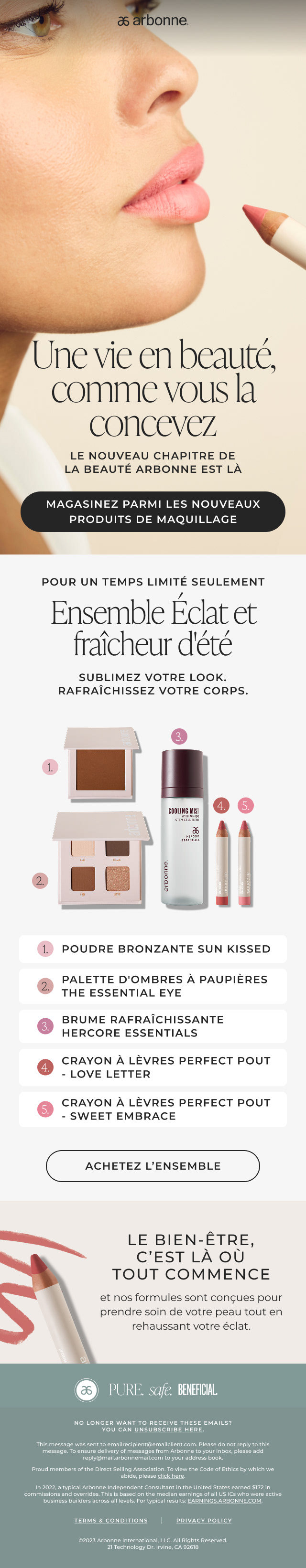 Localized field, email, web, and social assets for Arbonne across international markets, including French, Polish, Spanish, UK English, Canadian English, and AU/NZ English, through Exupery Design. Designed using Figma.
